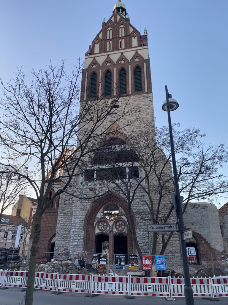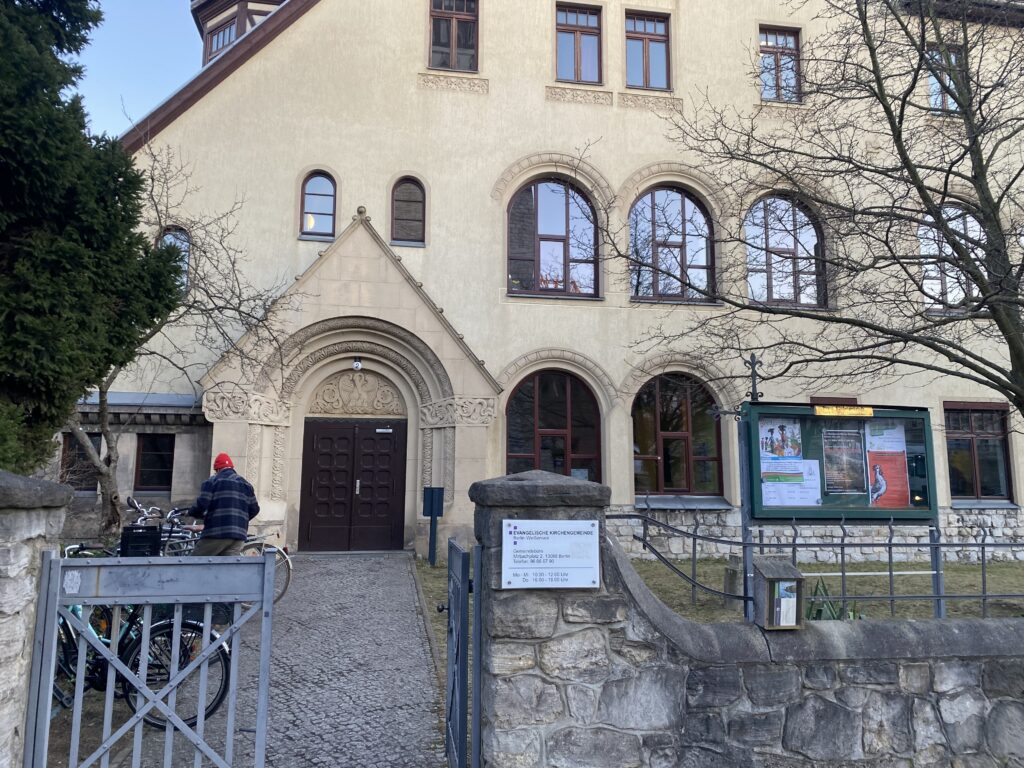 Das Gemeindehaus der evangelischen Kirchengemeinde befindet sich gegenüber der Ruine (derzeit Baustelle) auf dem Mirbachplatz. Wir erwarten Sie im ersten Stock im ‚Christenlehreraum‘.