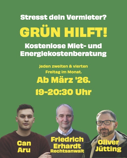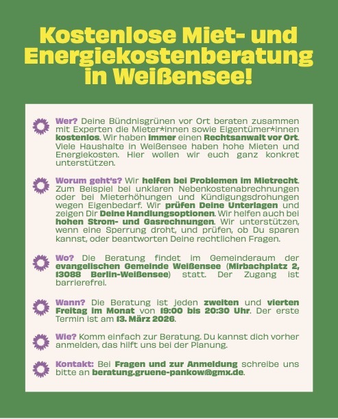 Deshalb biete ich – zusammen mit Herrn Can Aru (Kandidat für das Abgeordnetenhaus bei der Wahl am 20.09.2026 im Langhans-Kiez, Weißensee Süd, Wahlkreis 7) und mit Herrn Oliver Jütting (Kandidat für das Abgeordnetenhaus bei der Wahl am 20.09.2026 im Komponistenviertel, Weißensee Ost, Wahlkreis 9) – eine kostenlose Rechtsberatung für Mieter und Mieterinnen aus Weißensee an: